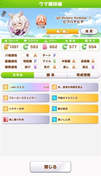 | 特殊二つ名 | 勝利の探求者 全レースで2着以内で、菊花賞、天皇賞(春)、宝塚記念を勝利し、目標を全て達成し育成を完了する |
