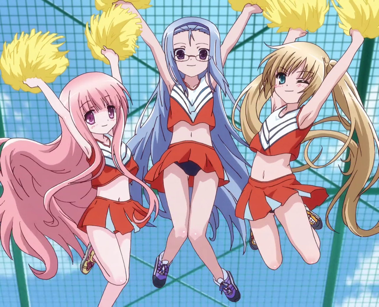 ポンポンを持って飛び跳ねる、チアリーダー衣装のひなた、紗季、真帆。スカートが捲れてブルマチラしている。