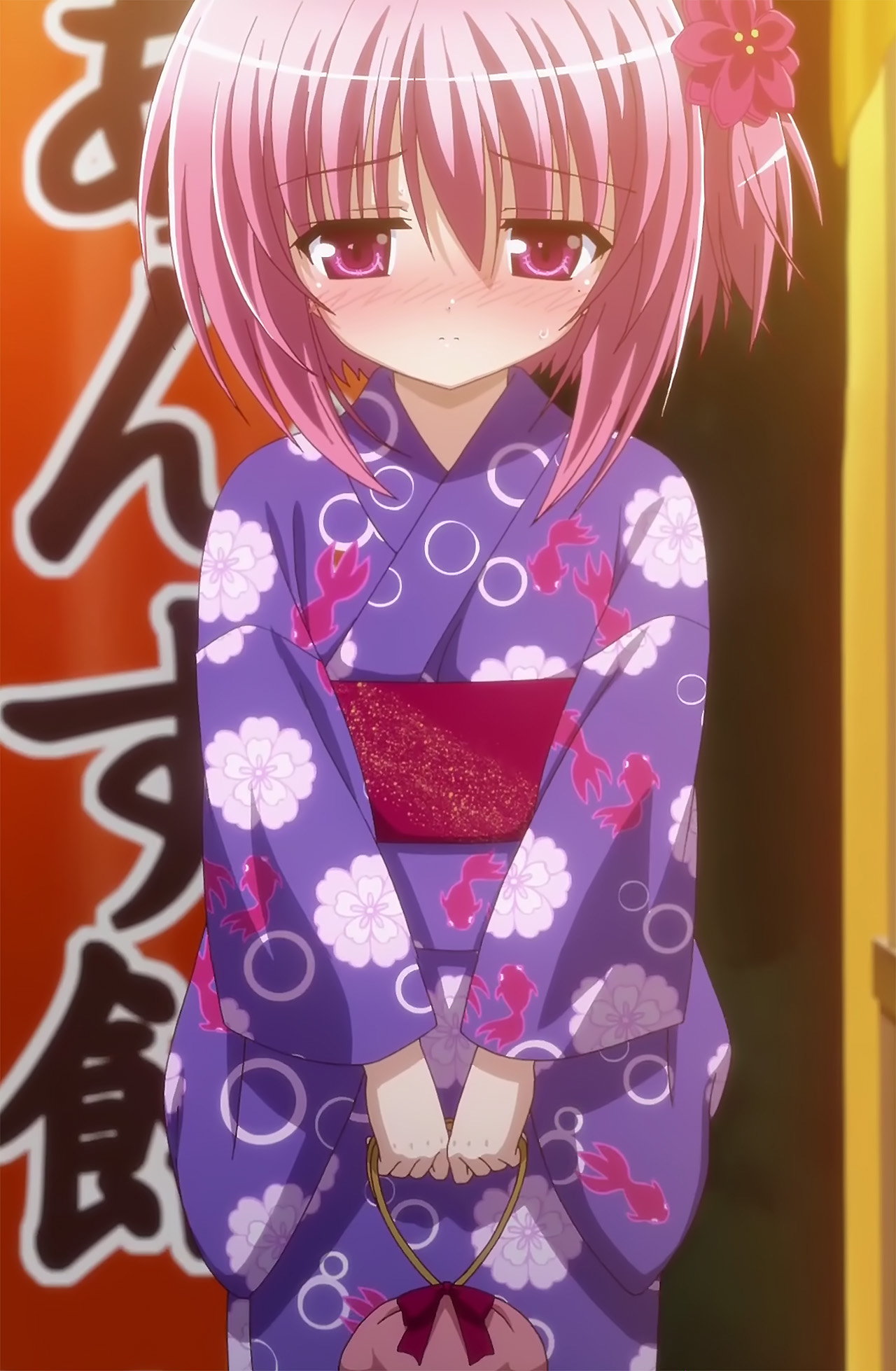 尿意に悶え赤面する、浴衣姿の智花。