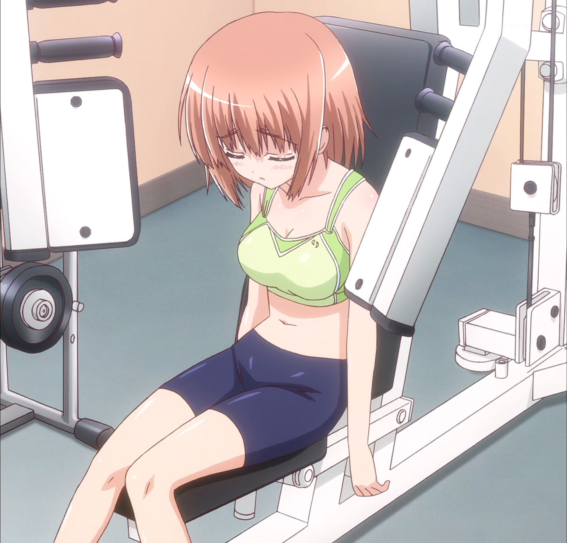 筋力トレーニング装置に座る、スポーツブラにスパッツの愛莉。