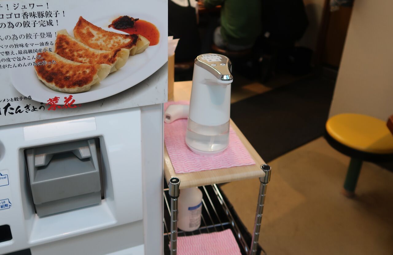 店舗看板の下に券売機があり、横には非接触式の消毒用スプレーが用意されあるので、消毒してから食券を買います。