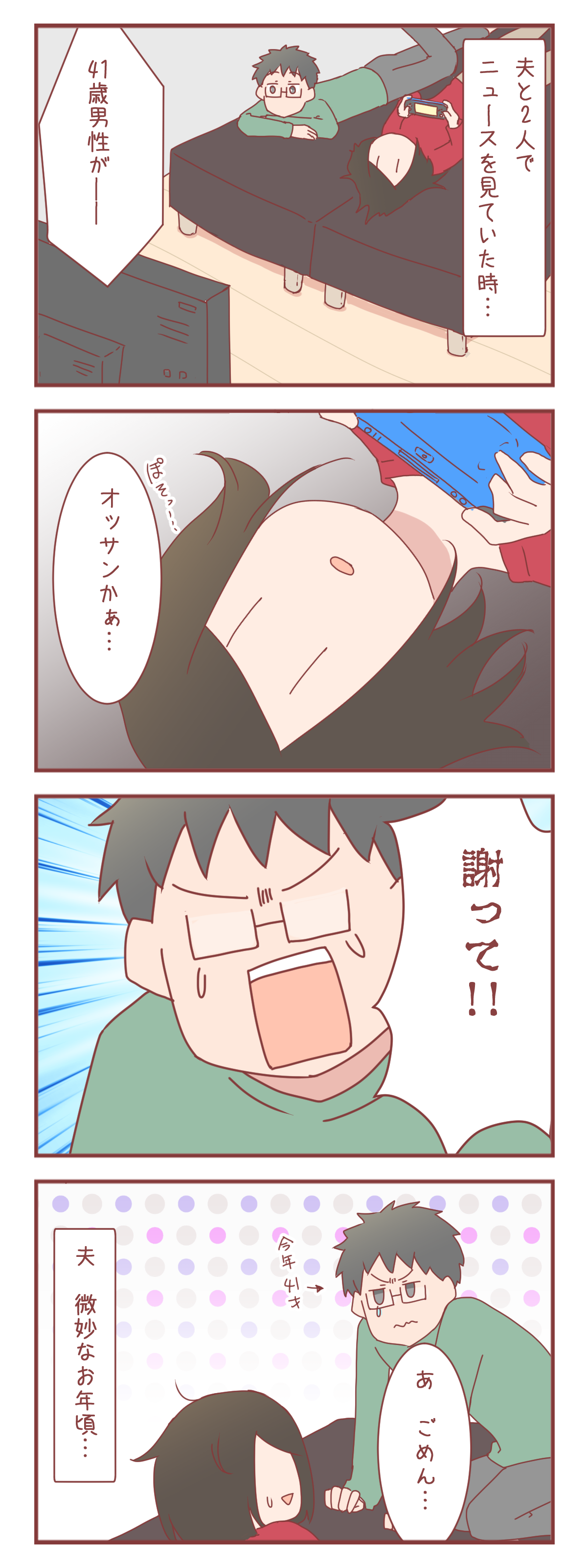 ★最初から読む /★日常ネタ /★婚活まとめ記事 /★元彼が消滅した話普段から夫の年齢を意識してないあまりポロッと口から出た言葉だけど、夫が思った以上に反応して「ごめん…」ってなった。
