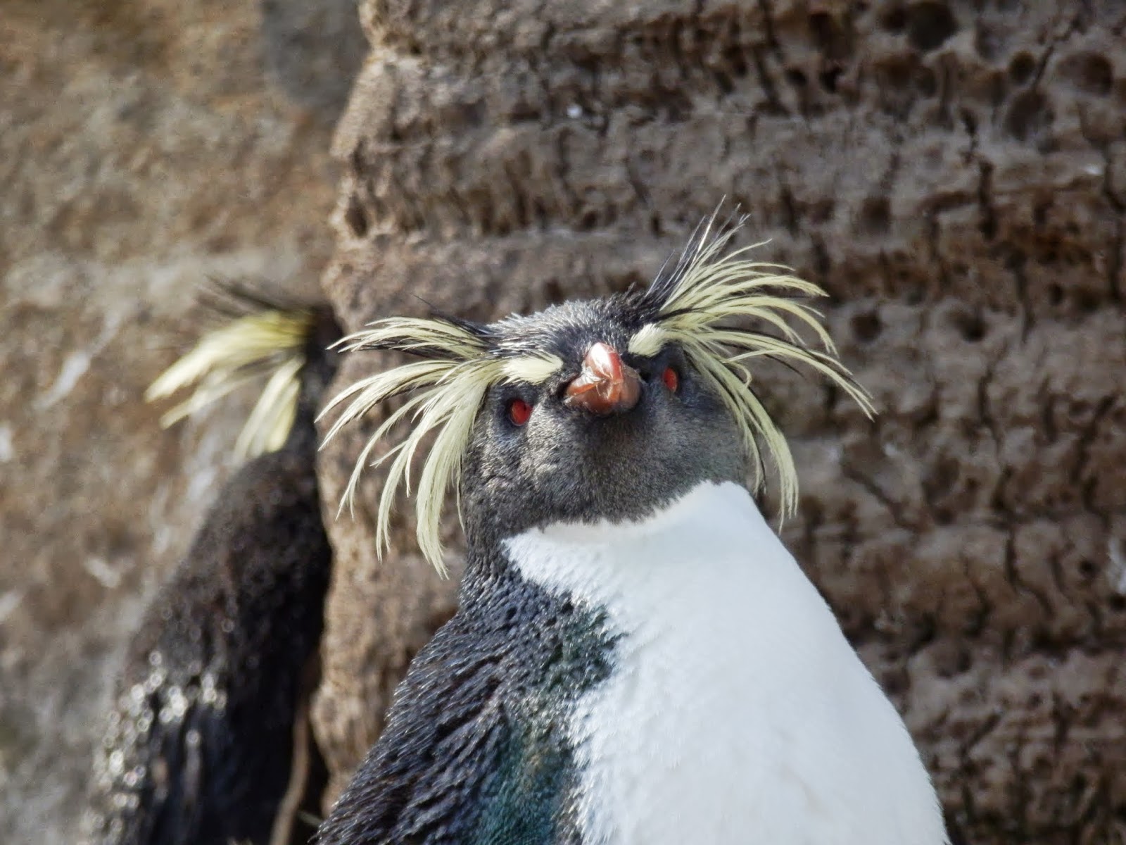 そんなカポーを見つめるイケメンペンギンさん。キタイワトビペンギンって目が赤いんだね、ちょっと怖いかも…(´・ω・`)