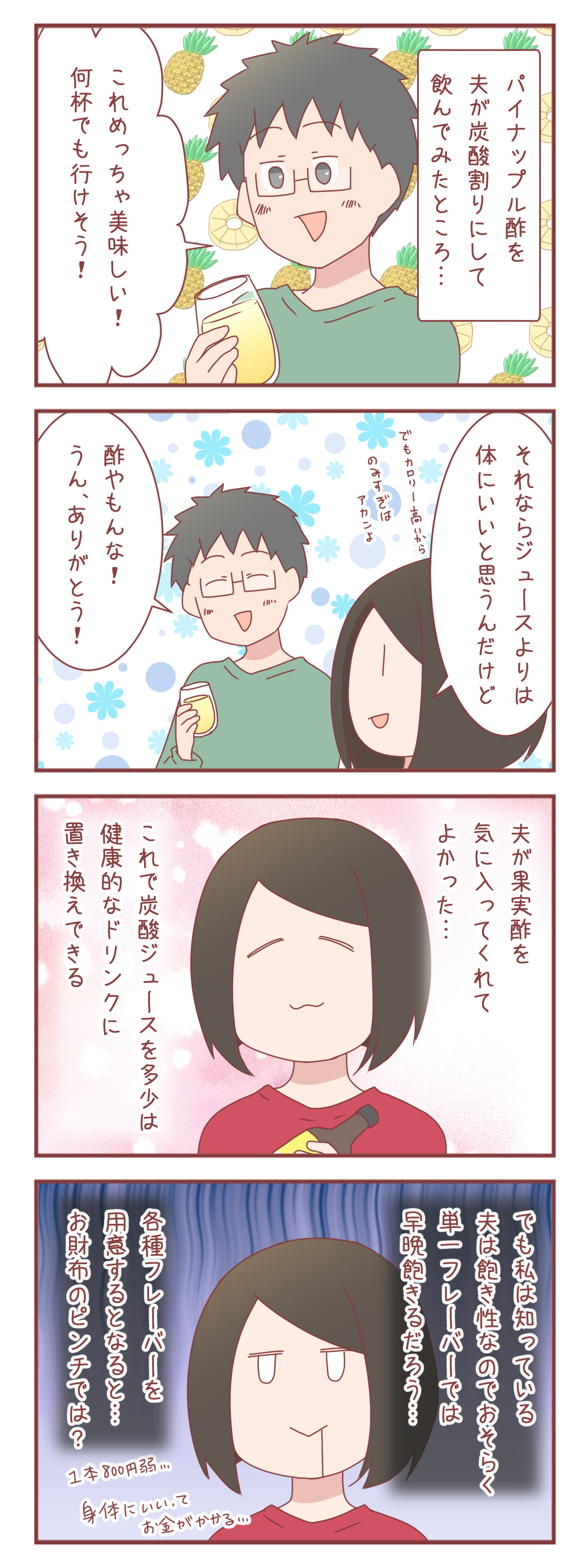 飲み物や食べ物に関して思考停止しやすく同じ物が続いてもあまり苦じゃない私と違って、夫はすぐに味に飽きてしまう方なので、パイナップル酢も早晩飽きるのが目に見えています。