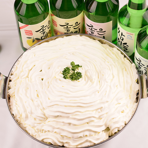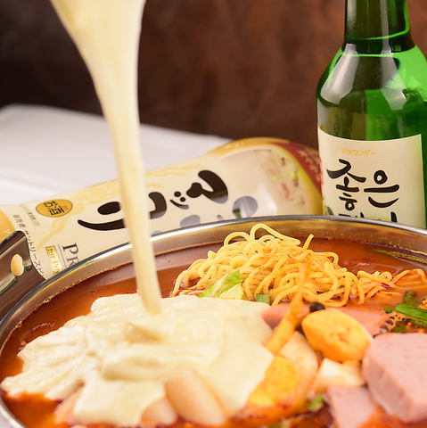 ピリ辛に仕上げた本格的なトッポギ鍋の上にとろ~りと、どこまでも伸びるチーズをたっぷりかけて濃厚に仕上げました。。※3~4名様で十分に召しあがって頂けるボリュームです