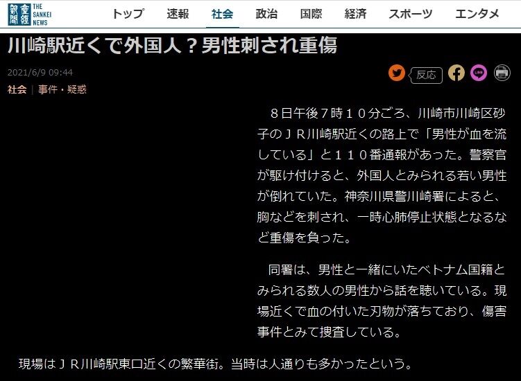 まず、川崎の駅前でベトナム人同士によると思しき刃物を使った傷害事件が起きました。