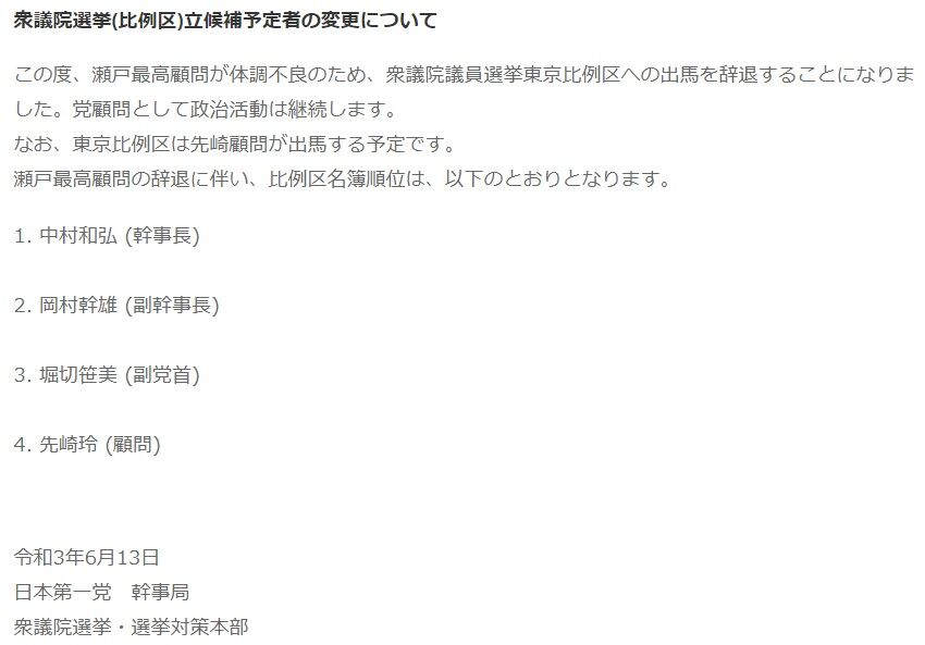日本第一党は公式サイト及びツイッターにて、衆院選(比例区)立候補予定者の変更を発表しました。