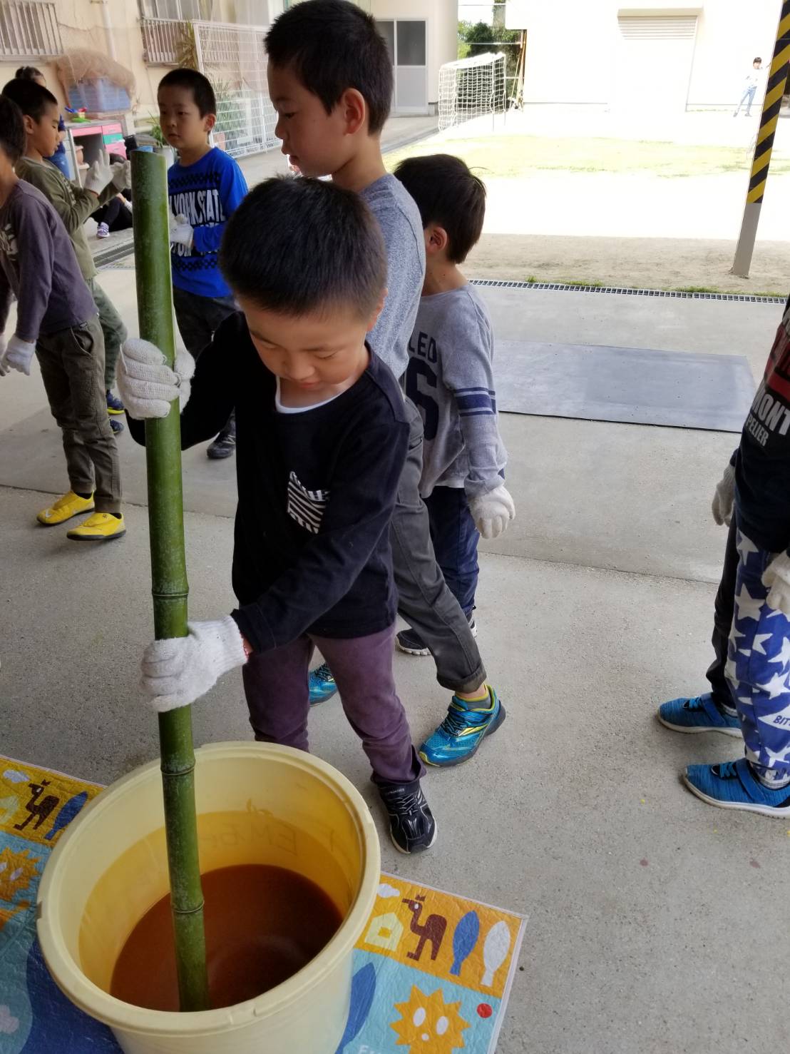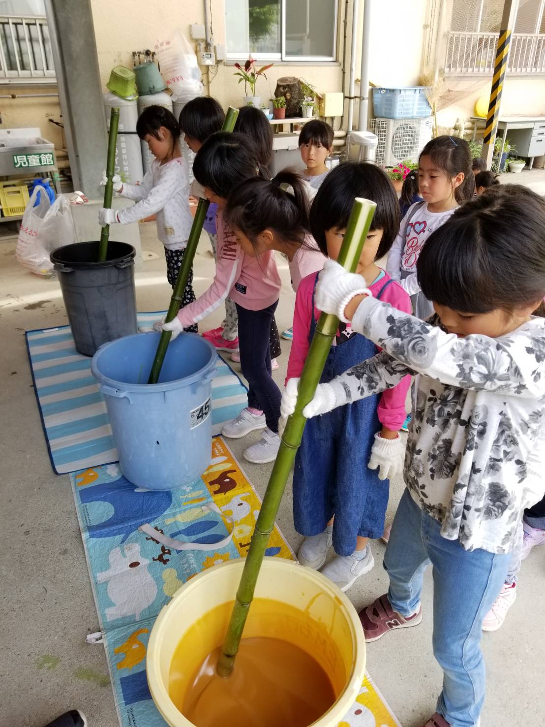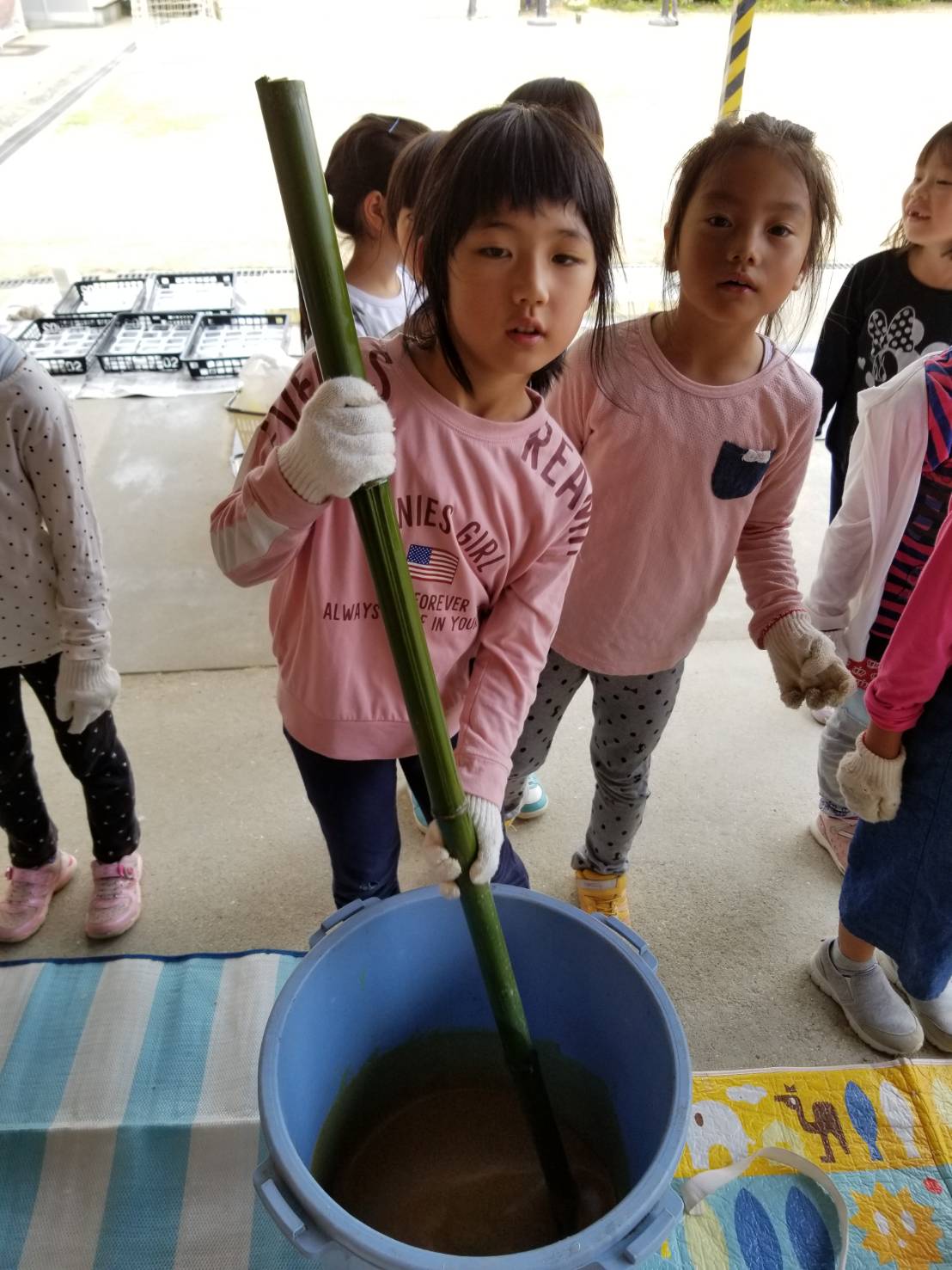 1年生も頑張って50回数えながら回していました。一人3回づづするとさらさらしていた液がマヨネーズ状になり完成です!