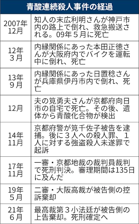 近畿3府県で夫や内縁関係にあった男性など計4人に青酸化合物を飲ませ、うち3人を殺害したとして殺人と強盗殺人未遂罪に問われ、一、二審で死刑とされた筧千佐子被告(74)の上告審判決で、最高裁第3小法廷(宮崎裕子裁判長)は29日、被告側の上告を棄却した。死刑が確定する。