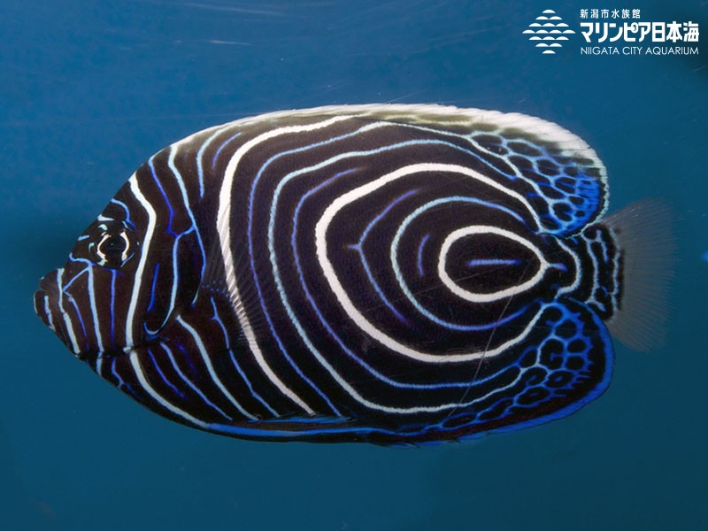 | 生物紹介 | 脊索動物門 硬骨魚綱 スズキ目 キンチャクダイ科 Pomacanthus imperator 英名:Emperor Angelfish (Juvenile) 全長40cm。幼魚と成魚とでは斑紋が著しく異なり、幼魚は暗青色の地に白色の渦模様があります。 |