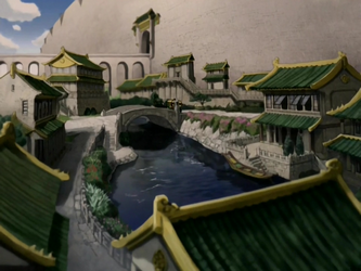 The Lower Ring is home to the poor classes of Ba Sing Se's society and the majority of its population. In the time of the Hundred Year War, these consisted of newcomers to the city, including its multitude of refugees. Most of the Lower Ring residents work with their hands as artisans, laborers, and craftsmen, while the rest are merchants and food vendors. Due to the impoverished state of the citizens of the Lower Ring, as well as the influx of refugees, the crime rate is significantly higher.[5] The Lower Ring is also the most densely populated area of Ba Sing Se,[41] with the most crowded area being the City Block, a haven for the very poor.[16] Buildings in the Lower Ring are generally small, because the Lower Ring houses the majority of the populace and many people need to be crammed into the space available. The roofs of most buildings in the ring are brown tiled, indicating the poor status of the owners. The Lower Ring's status and poverty have remained unchanged over centuries. While parts of it were modernized after the Great War, mainly transportation and communication, the Lower Ring has further deteriorated into an overgrown, overpopulated slum with a foul odor, detectable from an airship overflying the area. It is impossible to travel from the Lower Ring into the Upper Ring without a valid passport.[29] After the assassination of the Earth Queen in 171 AG, Ghazan used lavabending to take down the wall that separated the Lower Ring from the rest of the city.[8]