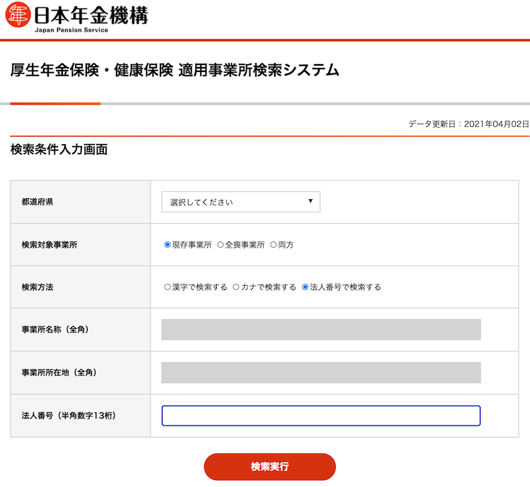 厚生年金保険・健康保険 適用事業所検索システムでの検索方法