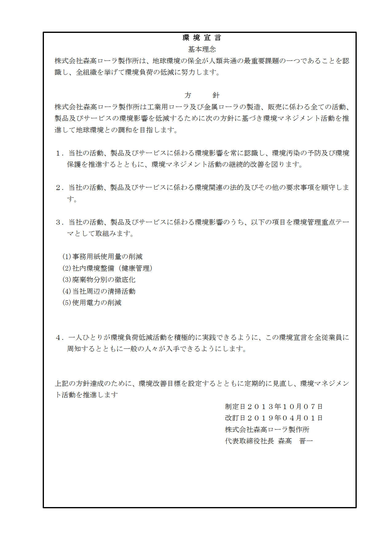 | 平成1年4月 | 株式会社 森高ローラ製作所を設立し、代表取締役に森髙鐵夫が就任 |