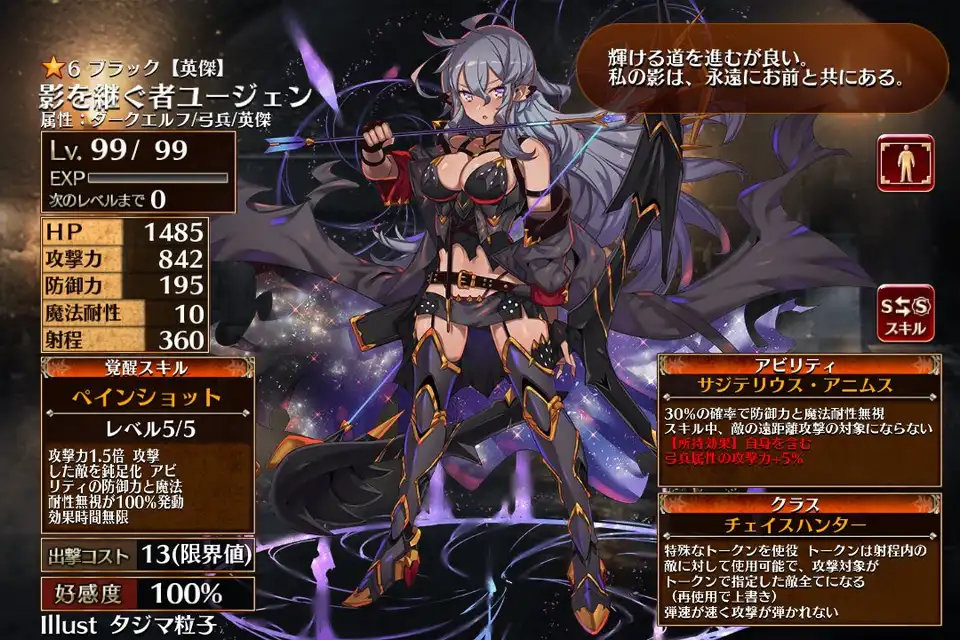 | サジテリウス・アニムス | 30%の確率で防御力と魔法耐性無視 スキル中、敵の遠距離攻撃の対象にならない 【所持効果】自身を含む弓兵属性の攻撃力+5% | 影を継ぐ者ユージェン |