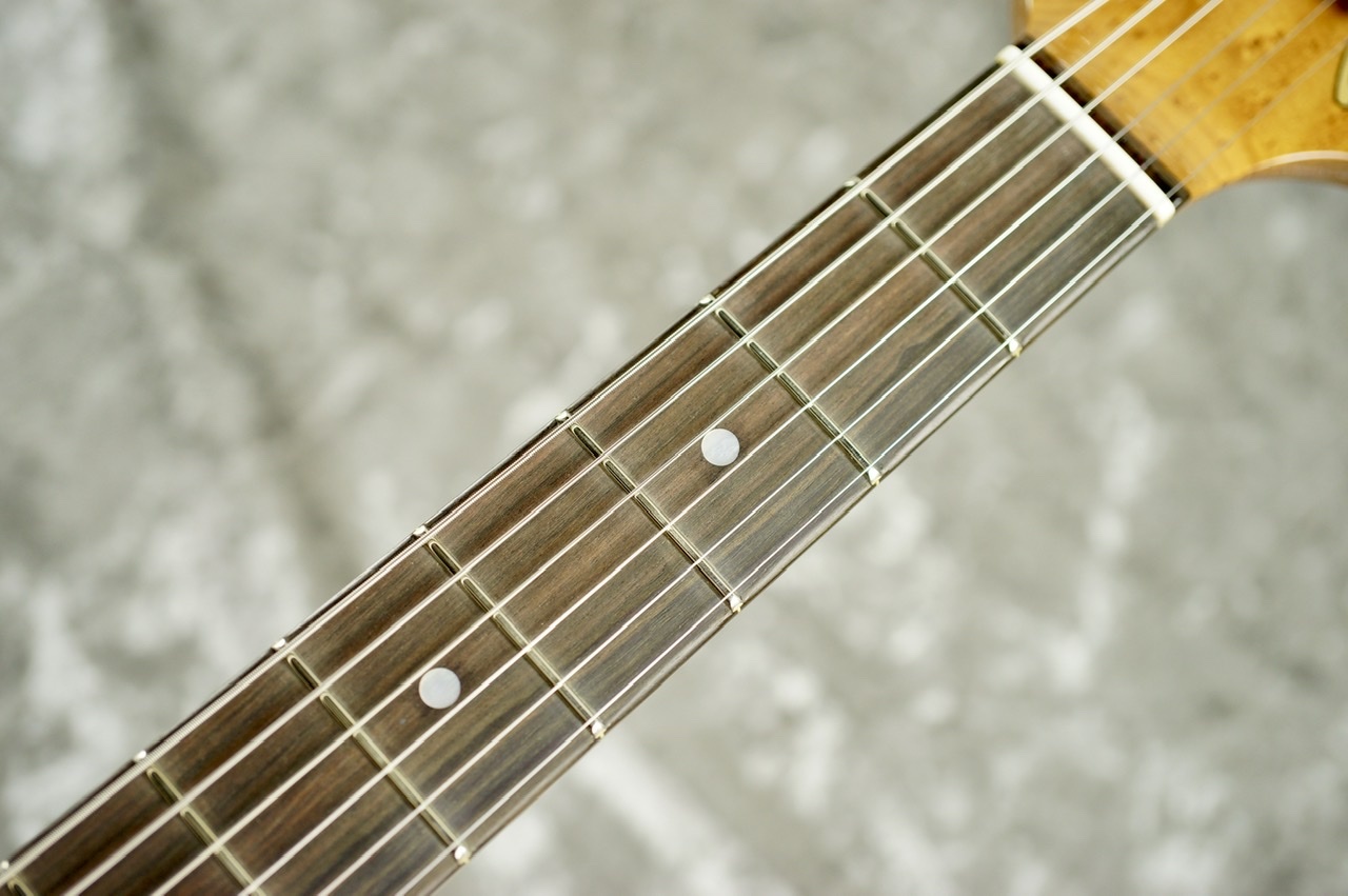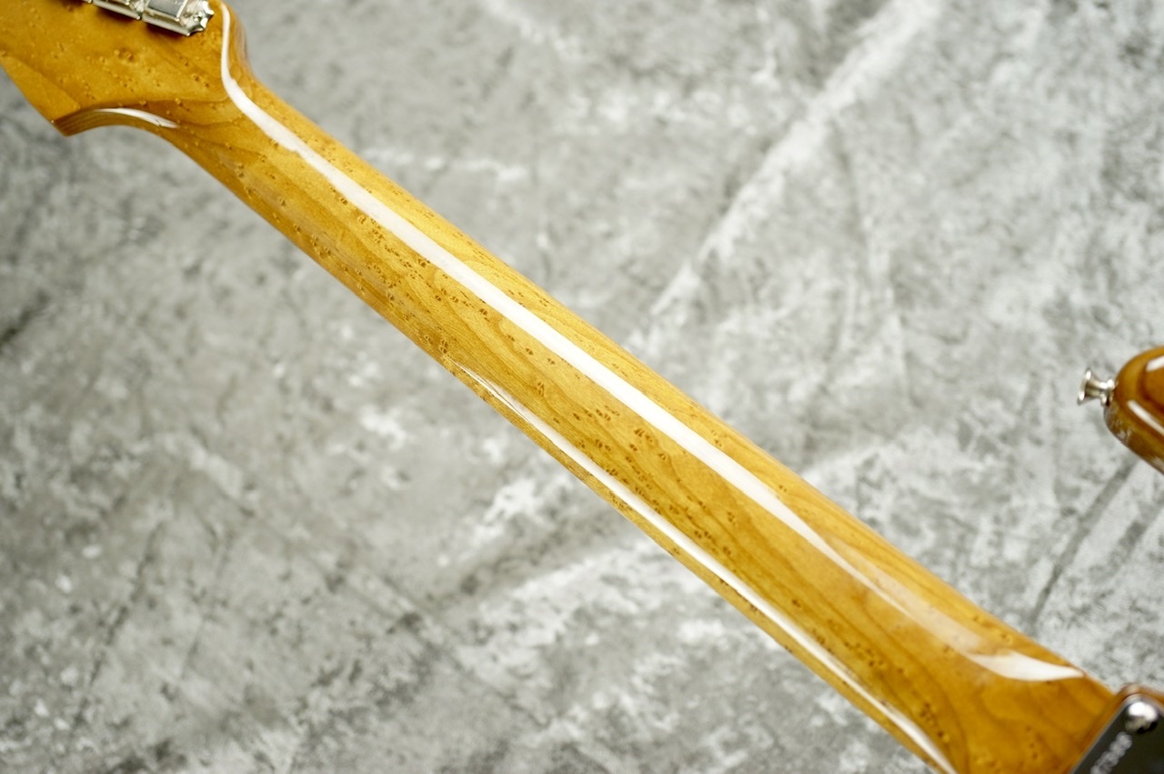 使用されており、ネック材自体もロースト加工が施されたバーズアイメイプルとなっております。ボディがセミホロウ構造のため