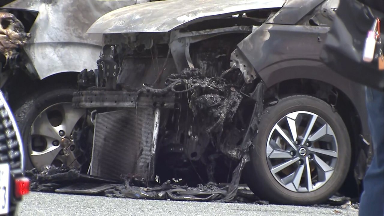 消防が駆けつけ消火にあたり、車1台が全焼したほか、隣に止まっていた別の車にも延焼した。