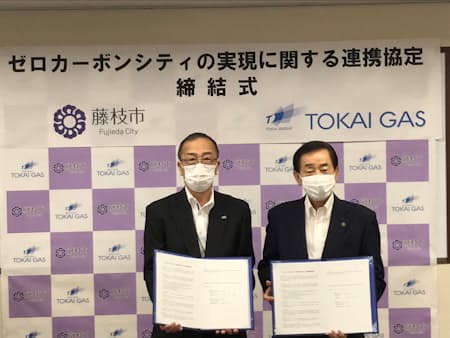 静岡県藤枝市とTOKAIグループの東海ガス(静岡県焼津市)は4日、藤枝市が掲げる脱炭素の街「ゼロカーボンシティ」の実現に向けた連携協定を締結した。東海ガスは13日から市庁舎南館に、温暖化ガス排出量を実質ゼロとみなす「カーボンニュートラル都市ガス」を供給する。省エネ機器への転換や導入についても支援する。