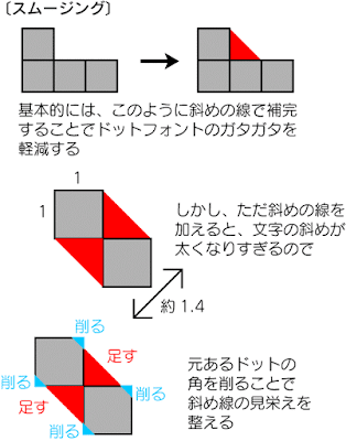 その後、スムージング処理も独自に発達はしましたが、アウトラインフォントの登場により、その役目を完全に終えました。でも、アウトラインフォントのワープロでも、外字を作るとやっぱりスムージングだったんですよね。