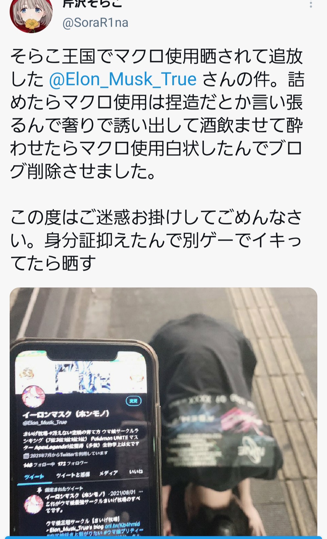 オフに呼び出して酒を大量に飲ませてマクロ使用を白状させてから暴行土下座強要恐喝