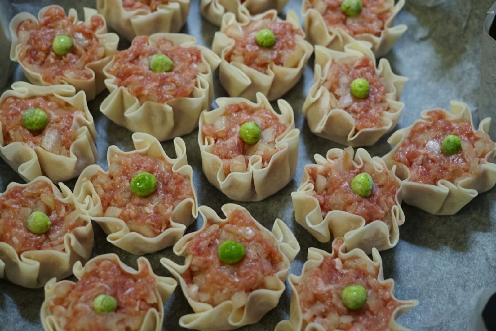 シュウマイ、今回はキッチンペーパーを敷いて蒸しました。