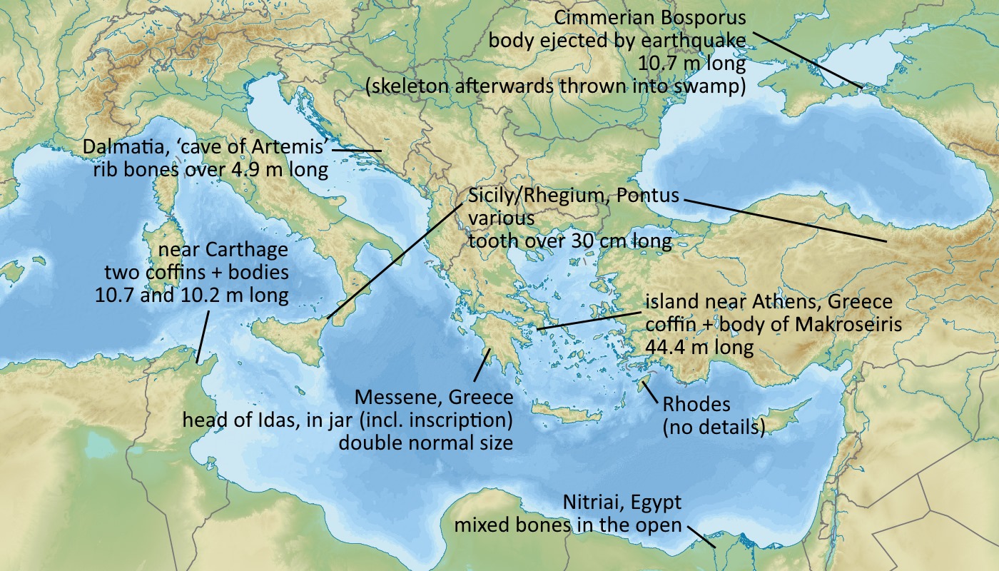 The huge bones were evidently prehistoric fossils which, compared to the skeletal remains of normal size, were in antiquity identified as relics of extinct races, usually those of giant heroes.Just for reference, Phlegon also tells stories like:
