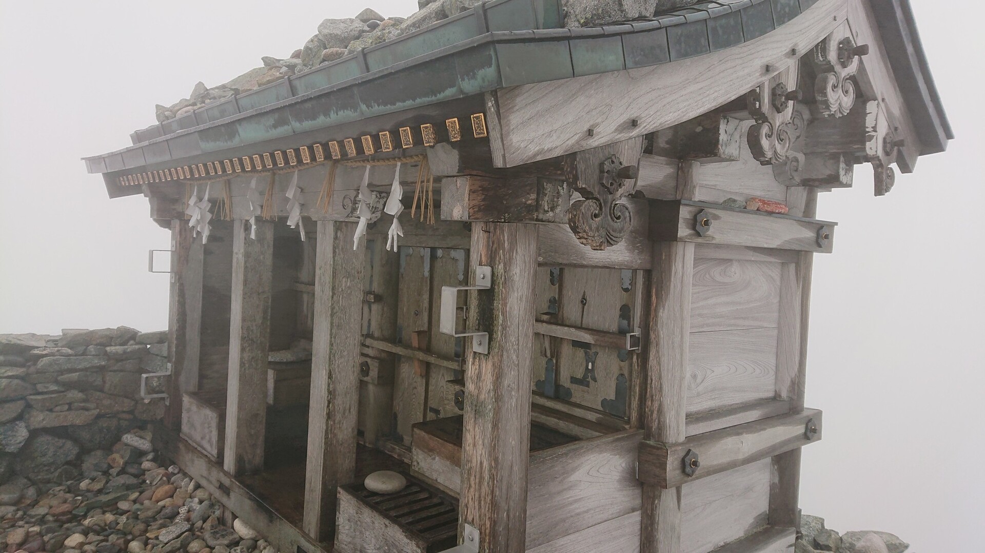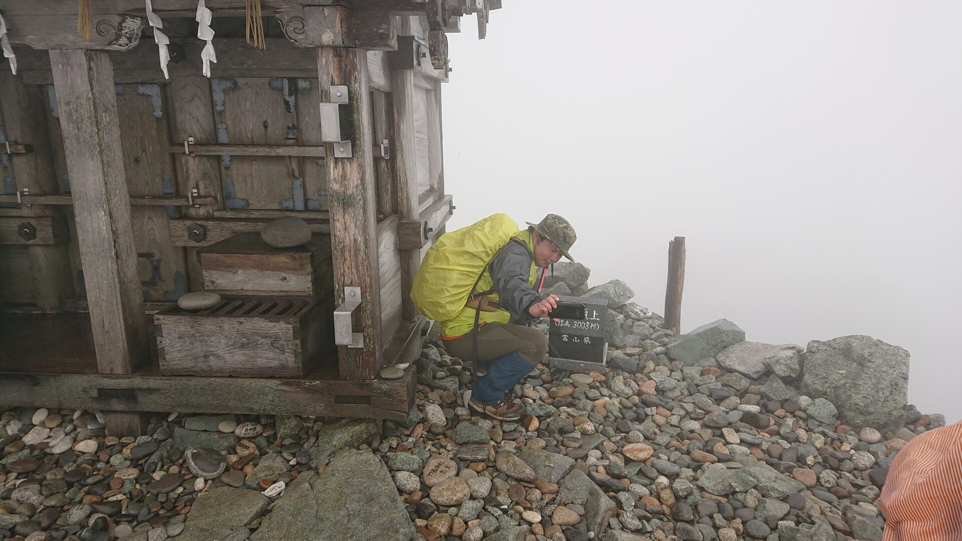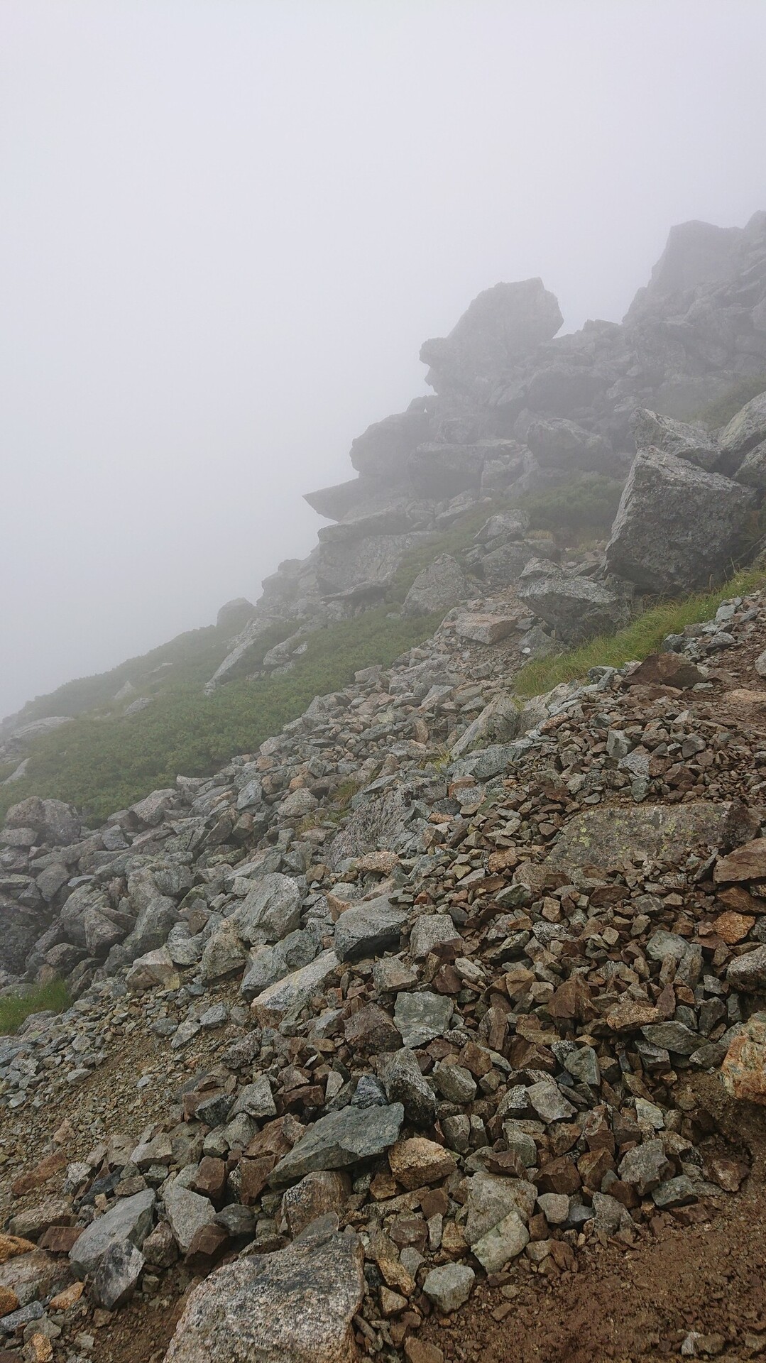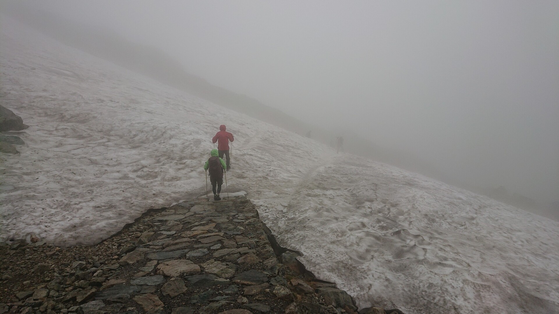 今年1番の目標:立山(雄山)登山です。 立山駅からパノラマバスで一気に室堂へ。 楽チン♪ ただし、途中から雨が・・・orz ま、仕方ない。室堂でカッパを着用して、いざ登山口へ。 今回は初めての立山と言うことで、シンプルに一之越経由雄山の往復。 途中で寒くなってカッパの中にフリースを着用。 雲なんだかガスなんだか、視界が10m位の中を一歩一歩進む。 風が強くなったり、雨が強くなったり。 でも、行動に影響するほどではないと判断し、そのまま登りきりました。 室堂から社務所まで、ほぼピッタリ120分でした。 山頂参拝と祈祷を受け、下山開始。 途中に雷が! すぐ横で雷が鳴る恐ろしさ。。。 雨も強くて痛いのなんの。。。 サクサク下山して、下りはほぼ休憩なしで70分位。 8月でも雪が残っていて、前の人が転んだ所、気を付けていたのに、全く同じ所で転けるww いやぁ、歩いているときは少し厳しかったですが、下山してみれば楽しかったと思えます。 次回は、室堂でテント泊して、雷鳥沢とか立山三山をグルッと一周したいッス。