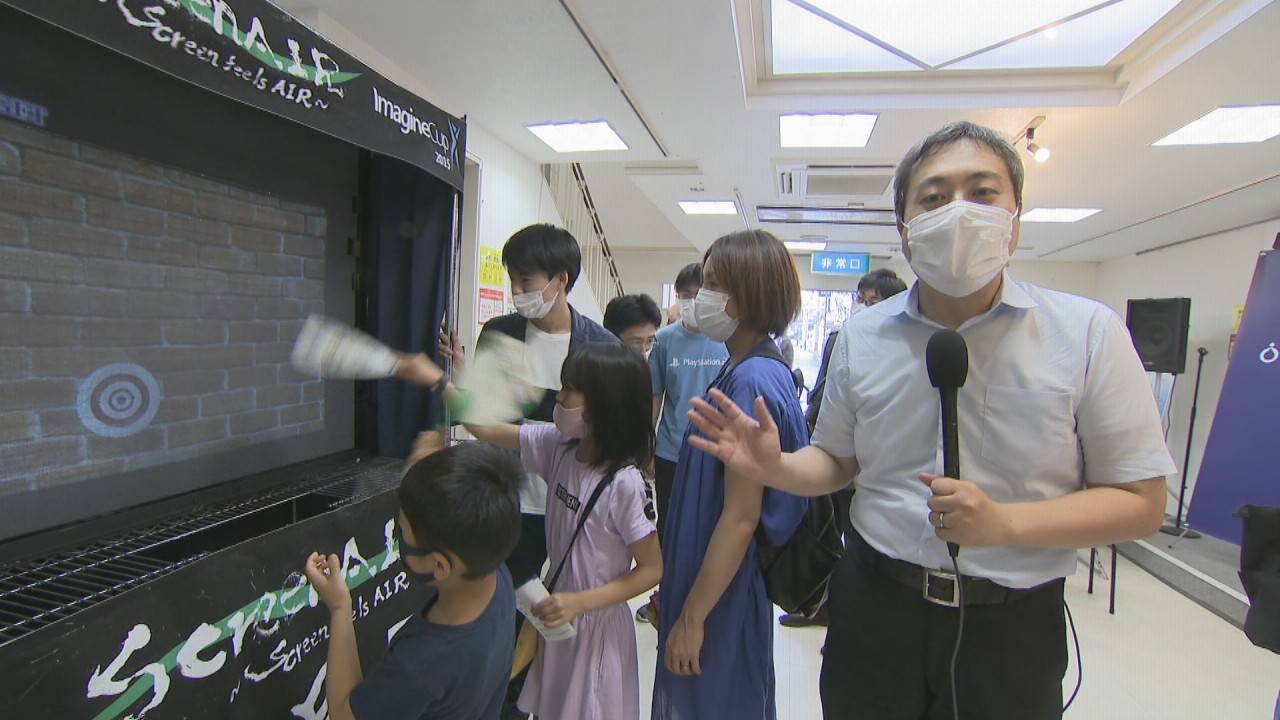 「こちら、学生がプログラミングしたゲームを体験できるコーナーです。香川県民にはおなじみ、うどんの湯切りを活用したユニークなゲームもあります」