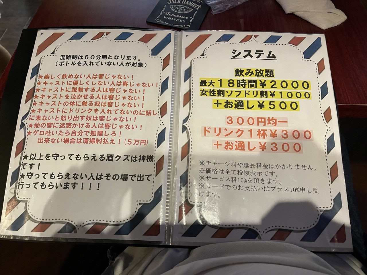 18時間飲み放題or一杯300円かの二択が出来るらしい。特に書いてないけど消費税10%追加した後に、サービス料10%を上乗せしてくるので、21%増し(汗)