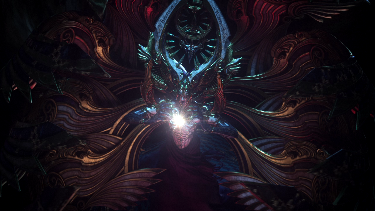 Bhunivelze's physical form is that of a metallic humanoid with androgynous facial features, azure eyes set against a white mask-like veneer with gold inlay with a fleur-de-lis-like adornment on his chin, purple robes, and four pairs of angelic wings. The wings are juxtaposed by horns and an ornate crown-like adornment hovers between them. In his official render Bhunivelze has a white sclera, but in-game it is black. His name, as well as the symbol also used by the Secutors of the Order of Salvation, are engraved on the horns. He has a second, more demented face on the back of his head and thus can twist his body to assume a bird-like perch with the scythe configured into talon-like projections.