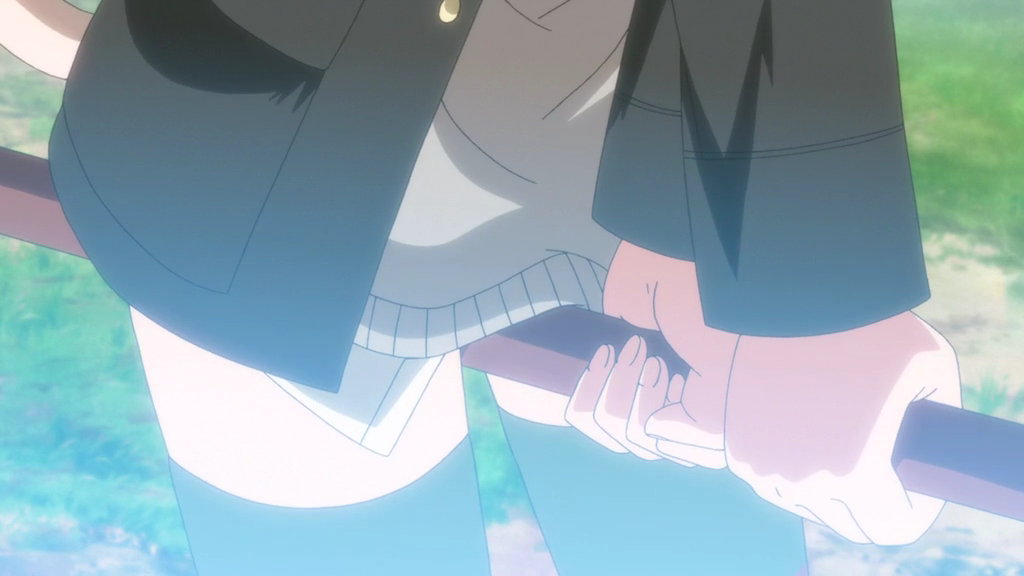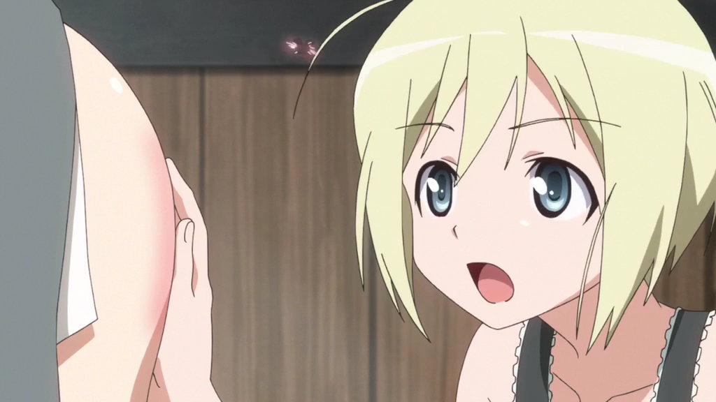 リーネに抱きつかれる芳佳の生脚・裸足。