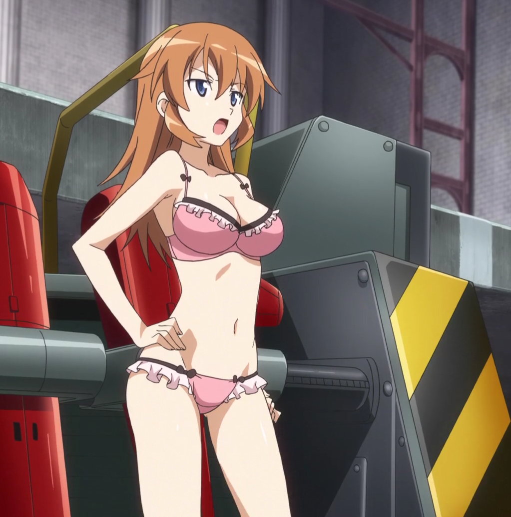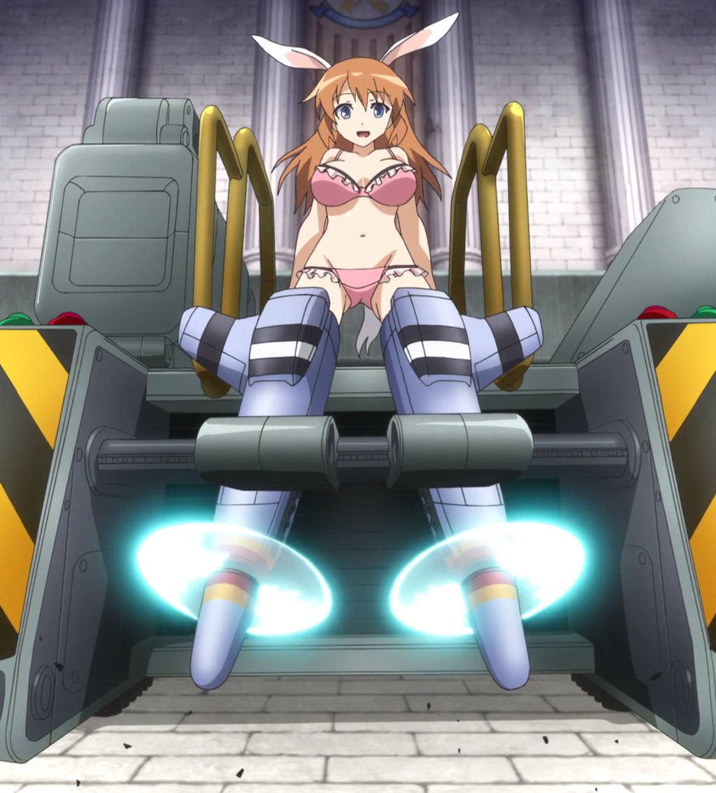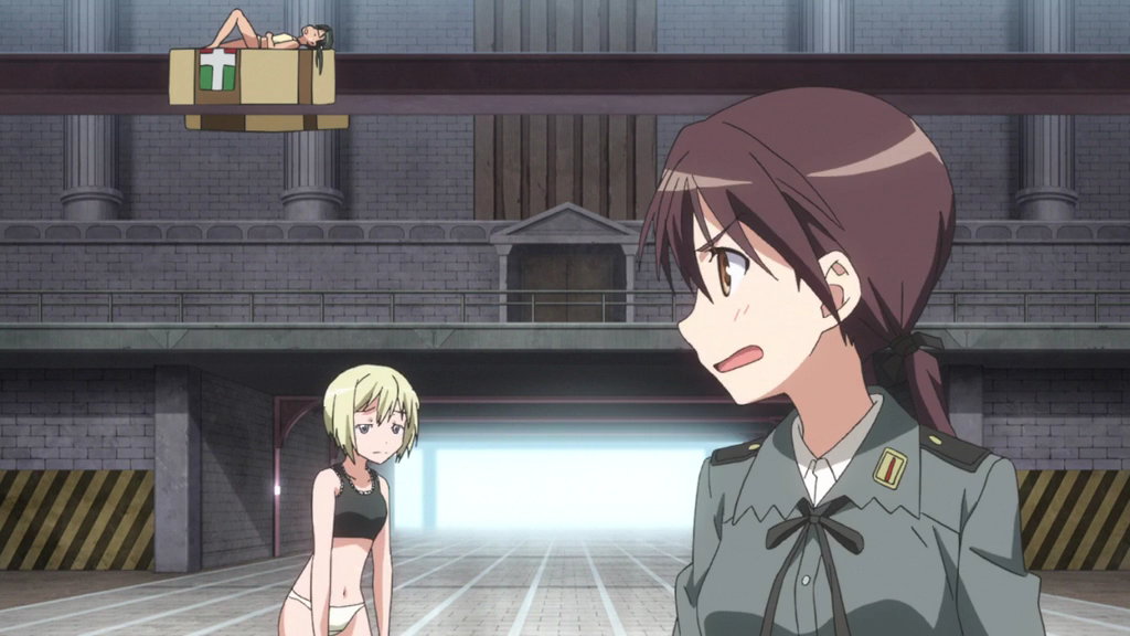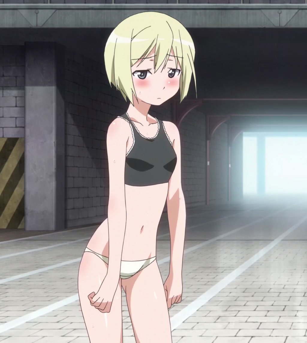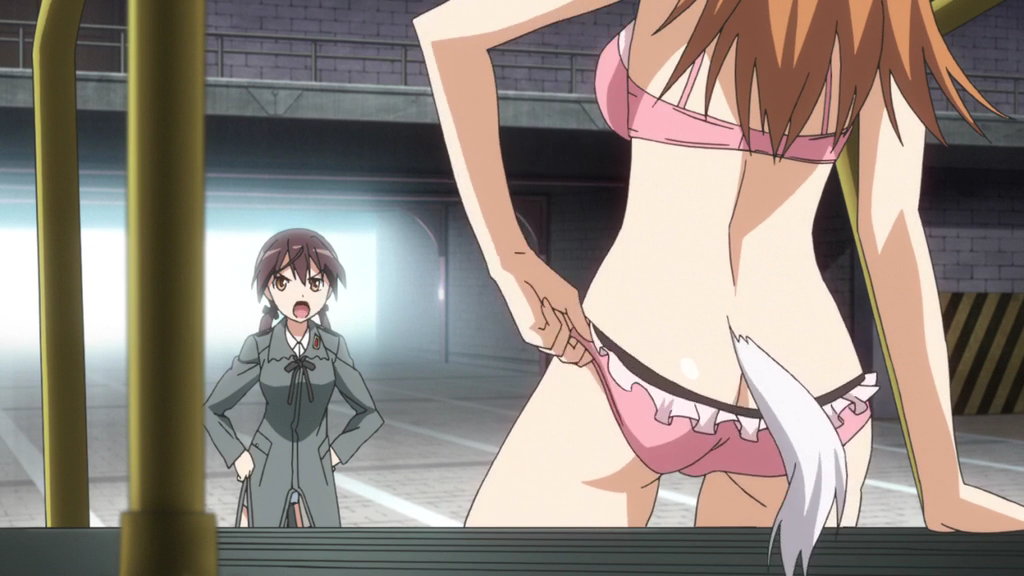 格納庫でストライカーを試運転する下着姿のシャーリー。