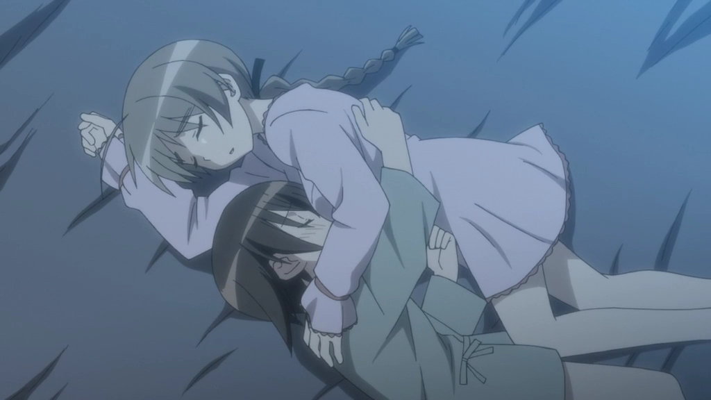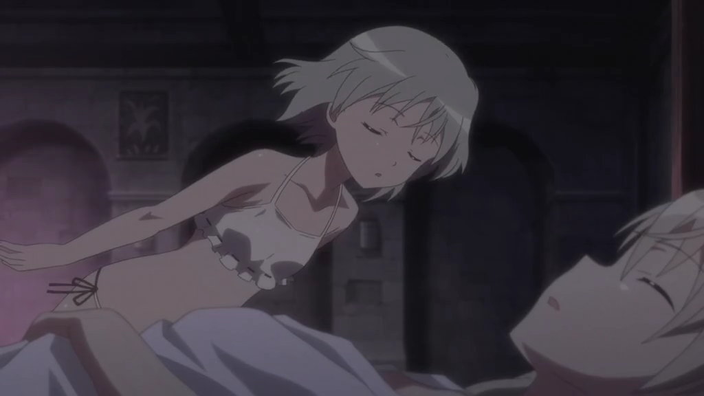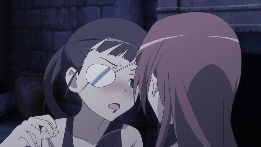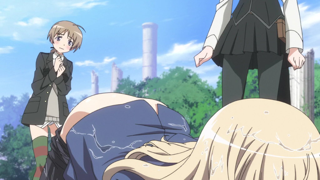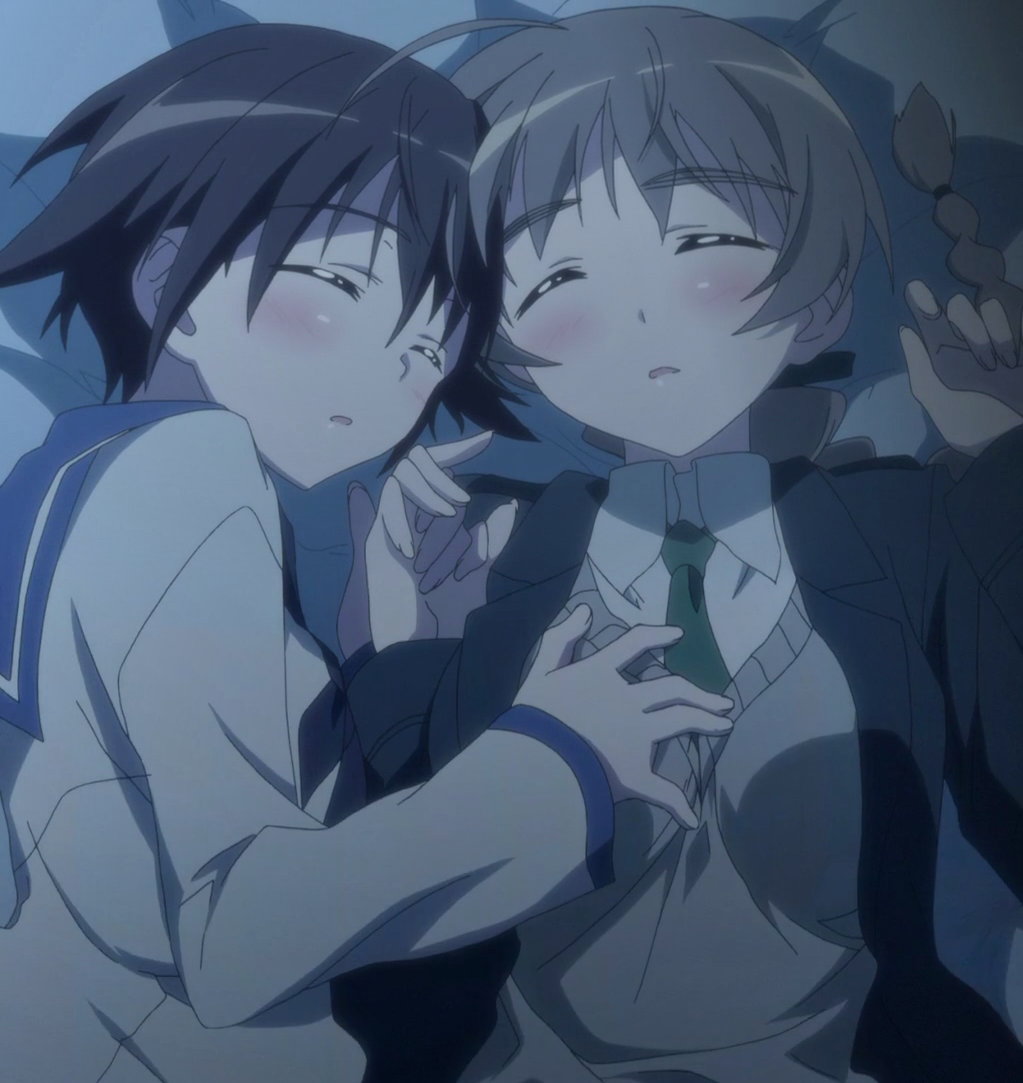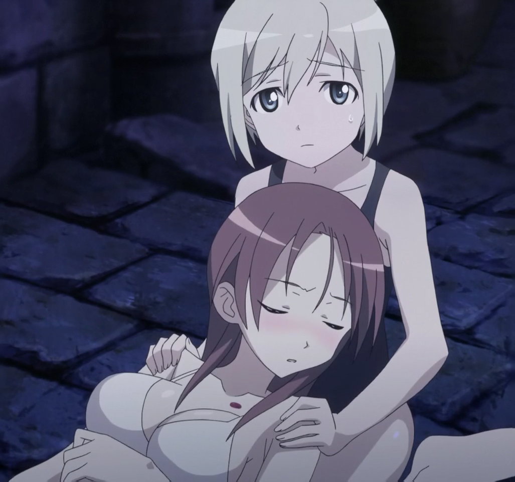 美緒に唇を奪われて気絶するミーナを介抱するエーリカ。
