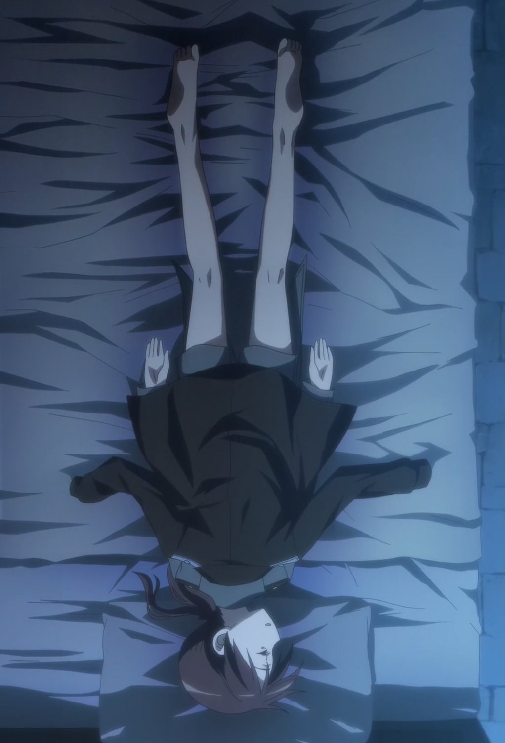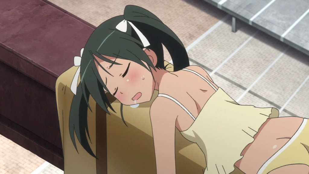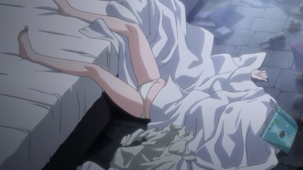 鉄骨の上で寝ている下着姿のルッキーニ。