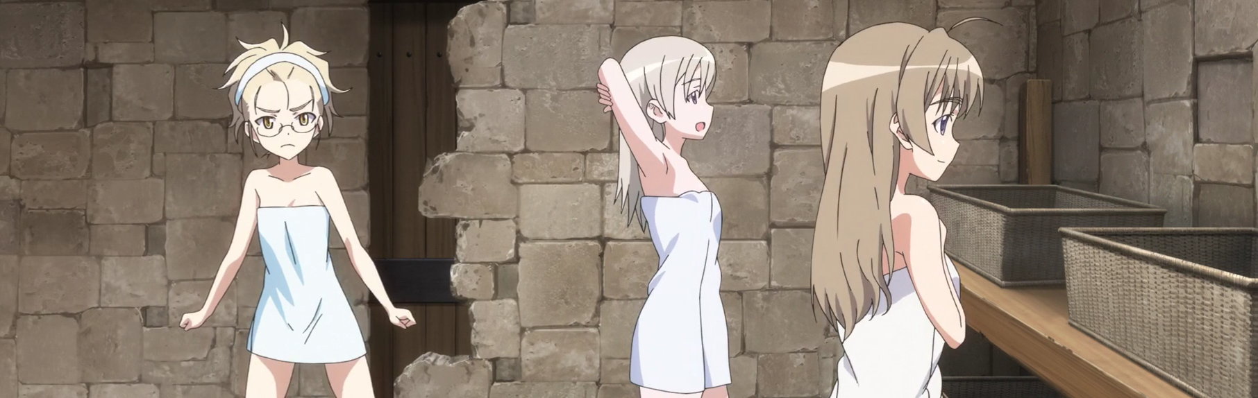 脱衣所にて裸バスタオル姿のウィッチーズ。