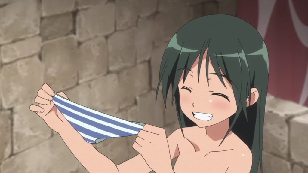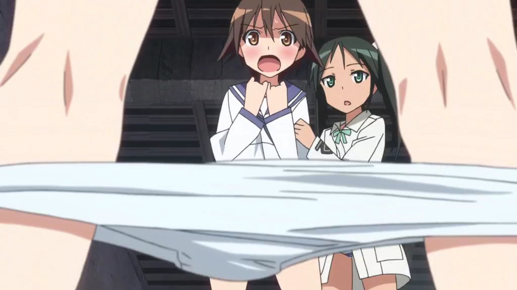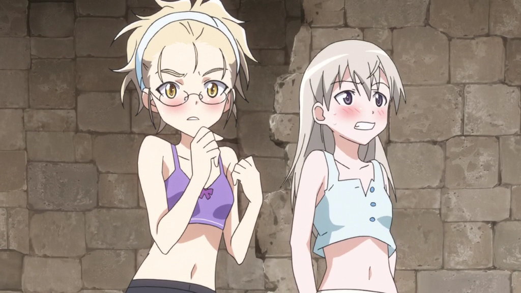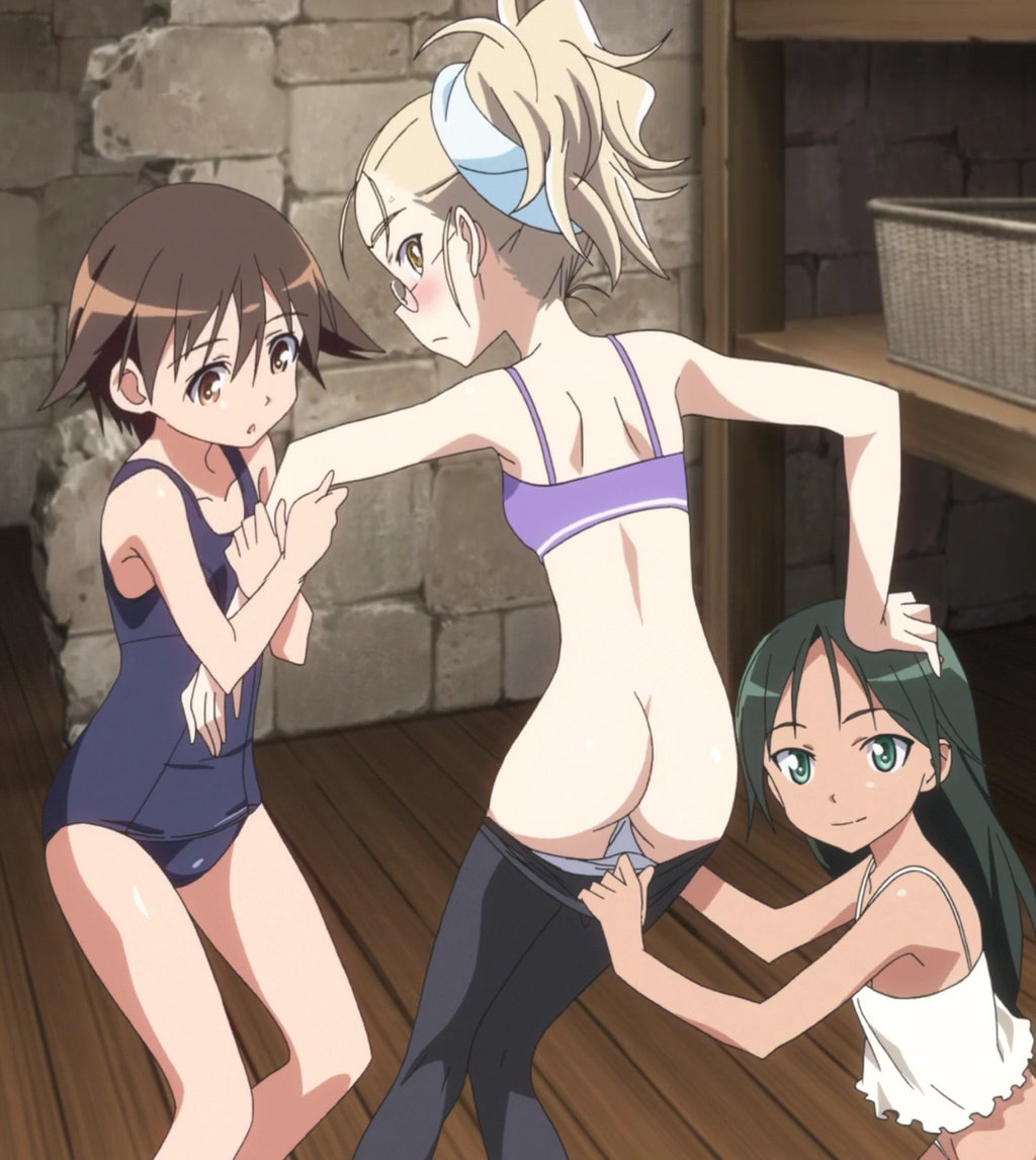 芳佳とルッキーニにパンツを脱がされるペリーヌ。