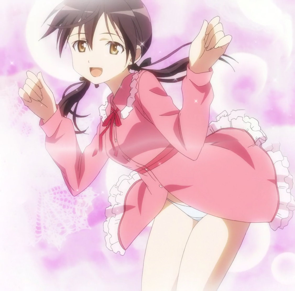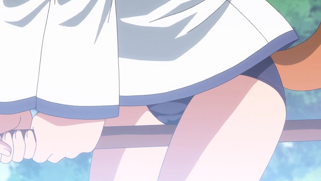 橋の欄干に座る寝間着の芳佳のパンチラ。