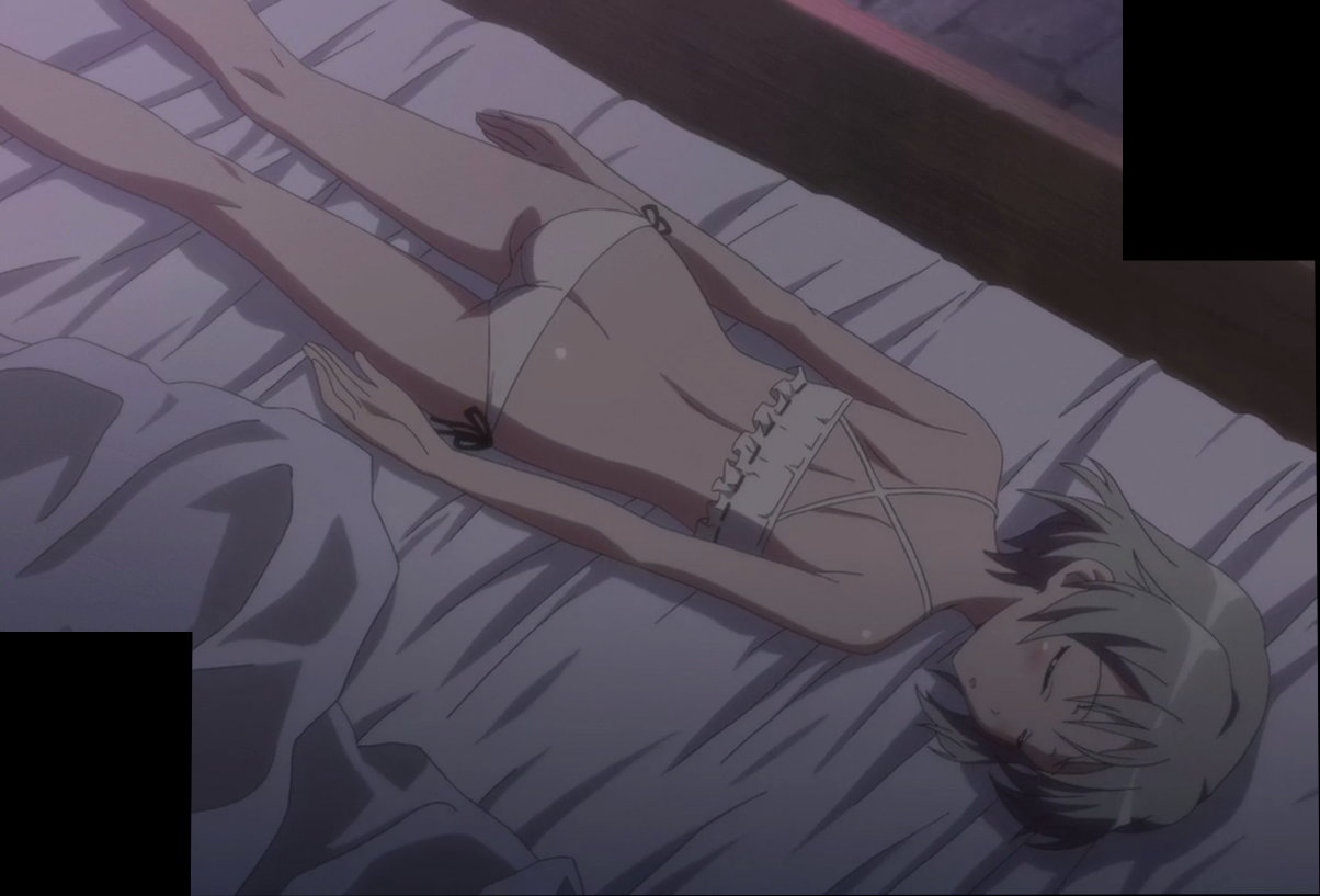 下着姿でベッドに寝そべるエイラ。