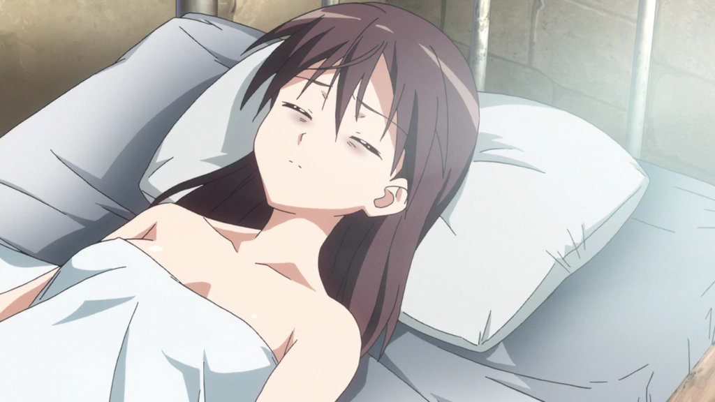 ベッドで寝ているペリーヌ、リーネ、芳佳。