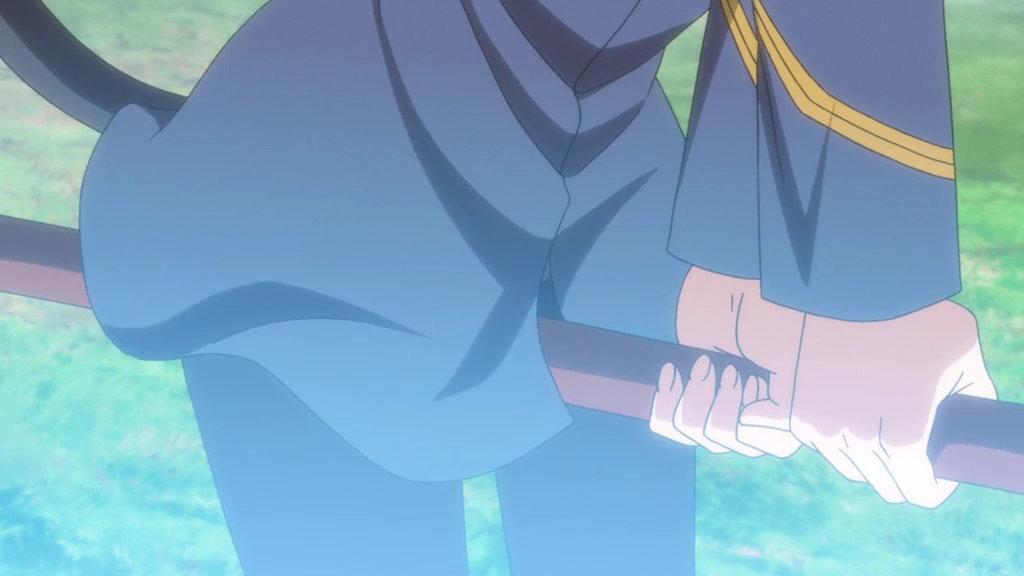 ルッキーニにお姫様抱っこされるマリア公女の生脚とパンチラ。