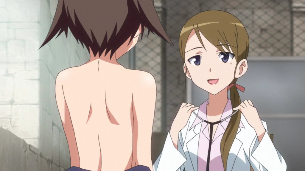 上半身裸で健康診断を受ける芳佳。