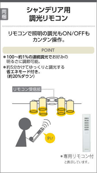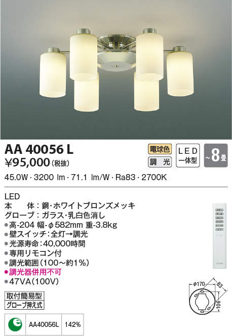 | 補足・注意事項 | ◆消費電力:45.0W ◆色温度:2700K ◆演色性:Ra83 ◆光源寿命:40,000時間 ◆専用リモコン付 ◆調光範囲(100~約1%) ◆調光器併用不可 ※色温度:2700K |
