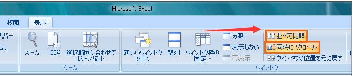 Excel[表示]タブ、[ウィンドウ]グループの[並べて比較]ボタンを、クリックでONにします。