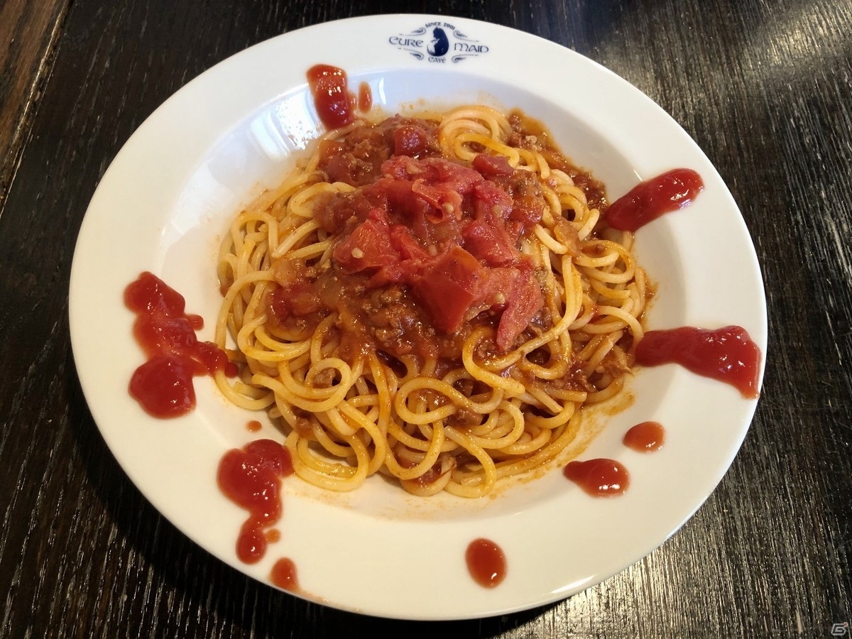 | キュアメイドカフェでも人気メニューの生パスタを使用した、こちらのメニュー。 とても物騒な名前のメニューで見た目も少々激しいが、 たっぷりのトマトと肉の旨味がぎゅっとつまったボロネーゼソースが、 もっちもちの生パスタに絡まった、とーっても美味しいハラワタ……もといパスタ。 意外と見た目よりもボリュームがあるが、美味しくてあっという間に完食してしまった。 |