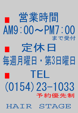 注:当店の定休日は基本的に毎週月曜日・第三日曜日ですが、臨時に変更する場合などがあります。ご来店希望日の営業確認とご予約の際にはお電話にてご確認下さい。