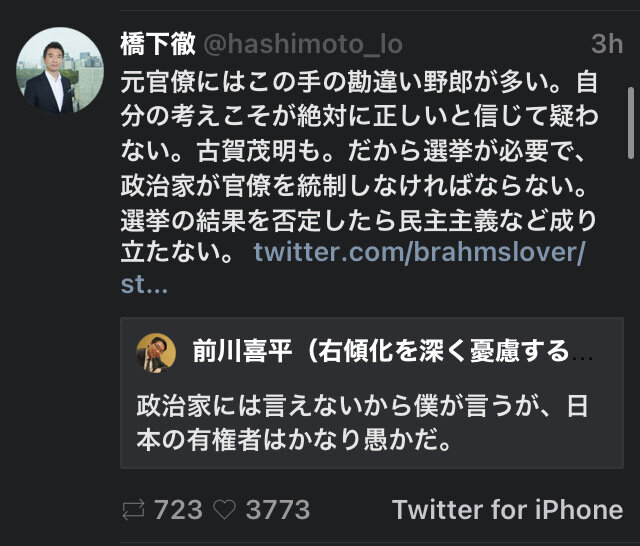 橋下「元官僚にはこの手の勘違い野郎が多い。自分の考えこそが絶対に正しいと信じて疑わない。古賀茂明も」