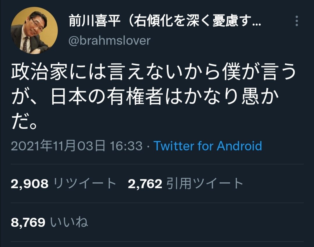 ただな、底辺のウヨサヨに乗っかって前川クラスが選挙結果を「バカの結果」なんて言い出しちゃダメなんだよ。選挙結果を否定しちゃダメなんだ。それこそ民主主義の否定になるからな。