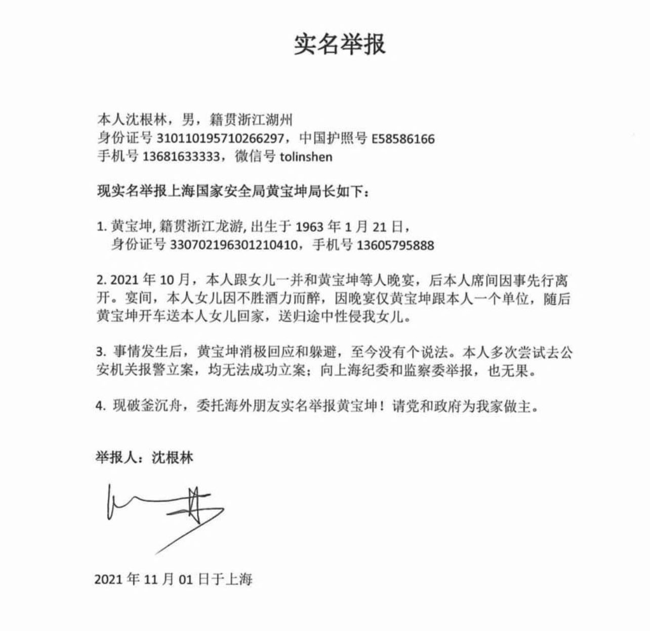 上海国安局的人举报上海国安局局长强奸了他女儿。