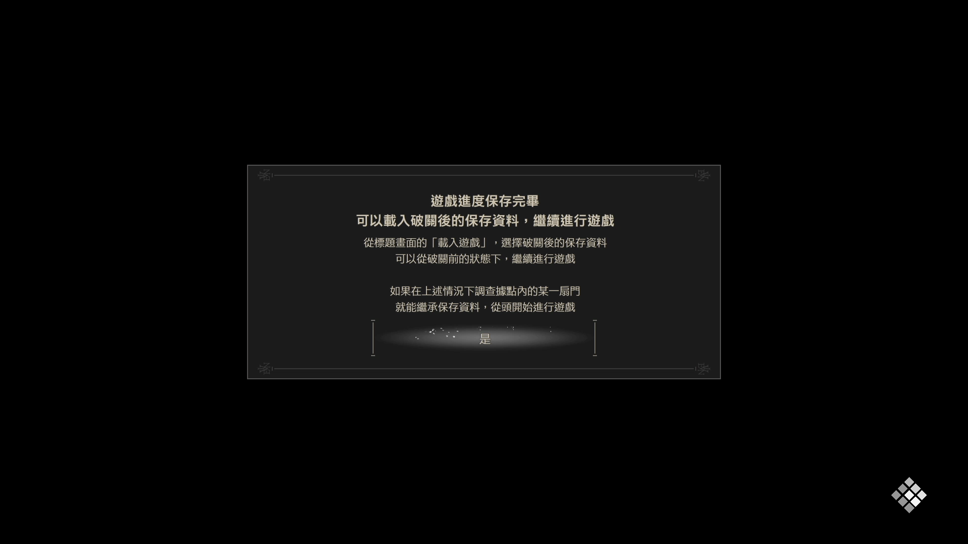 而遊戲設計有三種結局,我走到的應該是Ture End的「生息於黑暗之人」 ,因為看起來如果有續作,可以直接用這個結局來接,算是Happy End,我個人也滿意這個結局。