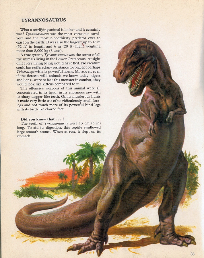Oh boy. Here we go. Rexy had yet to go through his first 'timid scavenger' phase when this book was written, and so he's naturally described as the most terrifying juggernaut of a beast the Earth has ever seen. The "most bloodthirsty predator ever to exist," "every living being would have fled," "no creature could have offered any resistance to it except perhaps Triceratops" - you get the picture. My particular favourite line here is