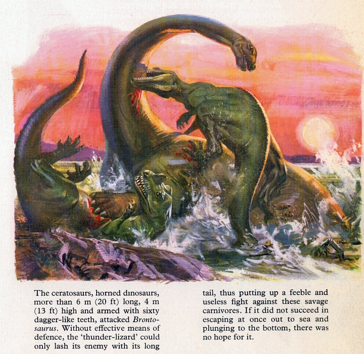 Now, if you ever loved dinosaurs as a kid, you'll recall that by far the most breathtaking illustrations in your various dino-books featured clashes between the great reptilian gladiators of prehistory. Tyrannosaurus v Triceratops. Allosaurus v Stegosaurus. Deinonychus v Iguanodon, which appeared quite a lot, even if it didn't really make sense. Everyone loves an epic reptile battle, and this book surely delivers. Here, a brontosaur engages two ceratosaurs in mortal combat. The text implies that boor old Bronto will flail uselessly before collapsing into a bloody heap, but the creature in the artwork is clearly having none of it, crushing one of its attackers underfoot while turning to face the other with a suitably stern look on its vanishingly tiny face. What a fantastically energetic and evocative piece - gotta love it.